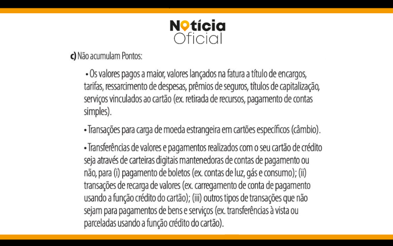Entretanto, a partir do dia 25 de novembro, haverá um corte no acúmulo de pontos em algumas transações, conforme mostra a imagem abaixo: